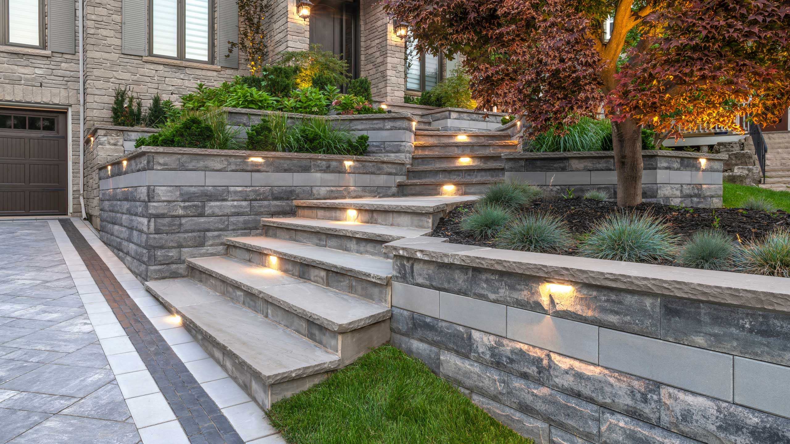 Walkways, steps, and entry areas are illuminated to improve nighttime safety.